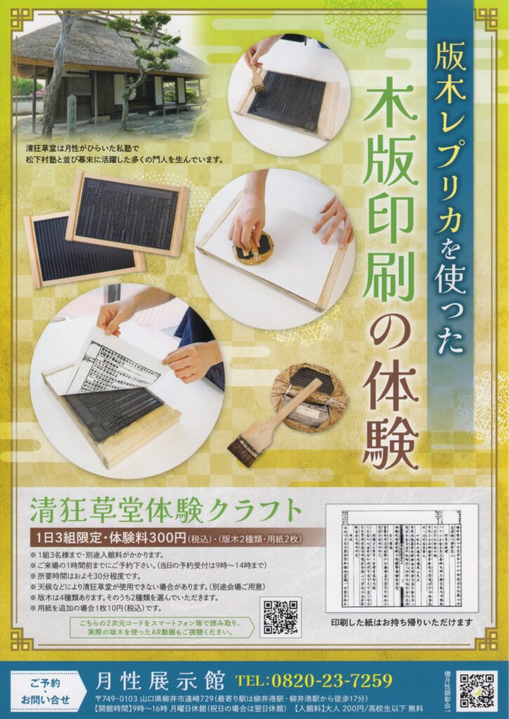 別途入館料(大人200円、高校生以下無料)がかかります。ご来場の1時間前までにご予約ください。当日の予約受付は9時から14時までです。所要時間はおよそ30分程度です。天候などにより清狂草堂が使用できない場合があります。その場合は、別途会場を用意します。版木は4種類あり、そのうち2種類を選んでいただきます。用紙を追加の場合、1枚10円(税込)です。