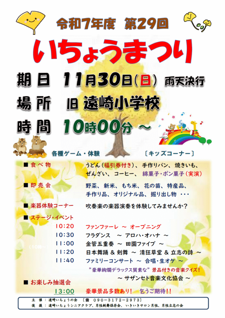 2025年11月30日(日曜日)10時から、旧遠崎小学校にて「第29回いちょうまつり」が開催されます。